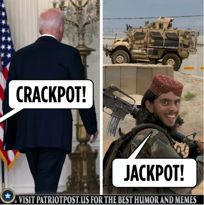 China Joe pronounces the word “TAL-EE-BAN,” which to me sounds Jamaican. It made me think of an old Harry Belafonte song, “The Banana Boat Song.” Here is that song. I changed it up a bit to match Biden’s pathetic strategy to get remaining Americans out of a country he so easily abandoned to our enemies.