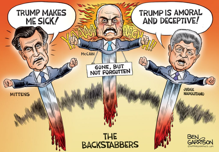 He voted no on repealing Obama Care, for example and supported open borders. He was a Deep State puppet, a warmonger and in the pocket of George Soros. Taking his place is Mitt Romney, who regularly condemns president Trump, perhaps out of jealously since he lost his own presidential bid.